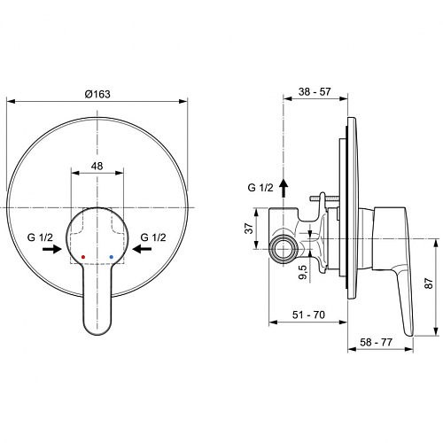 SESIA Встраиваемый смеситель для душа, комплект №1 A1300NU (встраиваемая часть) + комплект №2 (внешняя часть), картридж 47 мм с функцией HWTC, с функцией CLICK, металлическая рукоятка с индикаторами горячей/холодной воды.