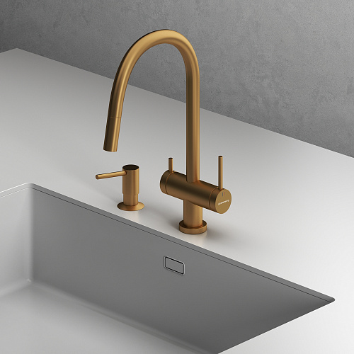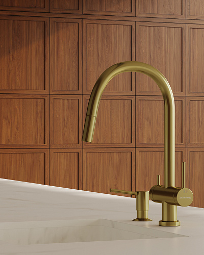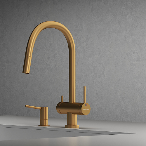 Смеситель для кухни ABELSBERG Aera c вытяжным изливом и возможностью подключения фильтра для воды, цвет королевское золото, PVD покрытие, арт. EMF71709BG