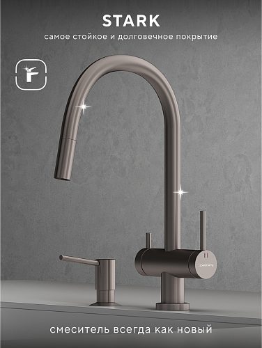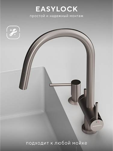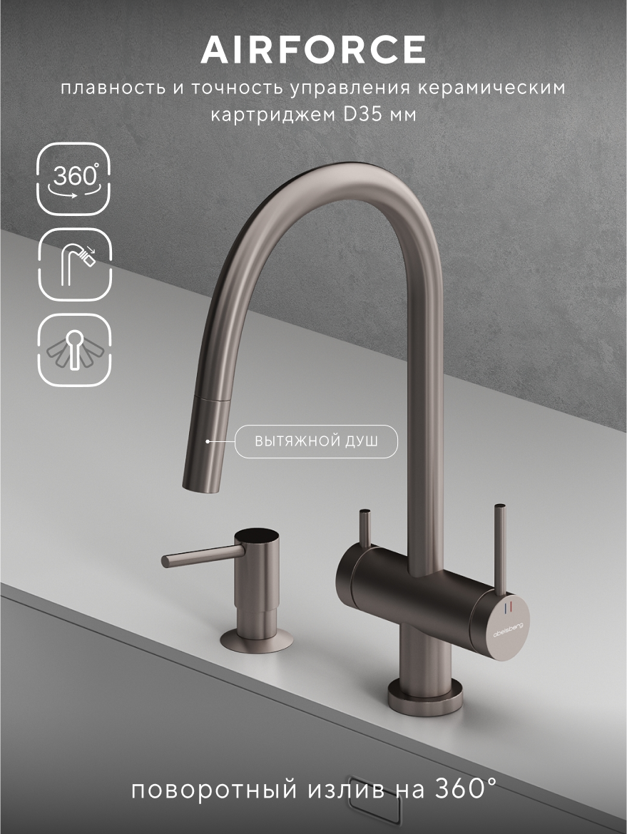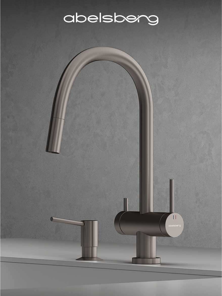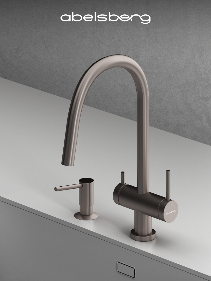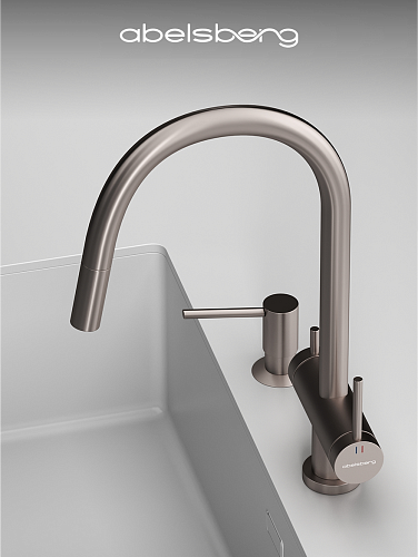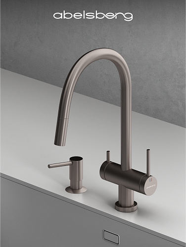 В коллекции Abelsberg Aera также представлена модель с вытяжным душем. Благодаря удлиняющемуся изливу, смеситель легко адаптируется под любые кухонные задачи — от мытья посуды до наполнения крупных ёмкостей. Abelsberg Aera с вытяжным душем – это современный функционал в классической форме.