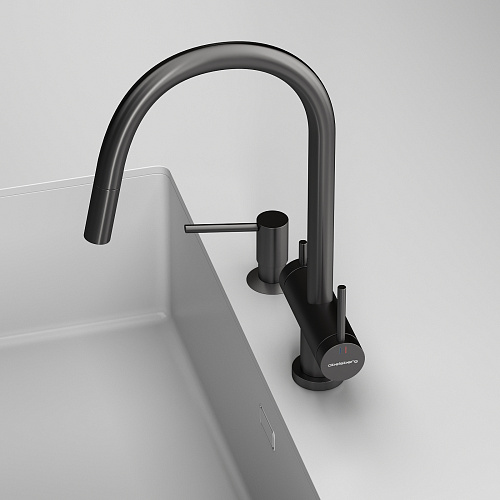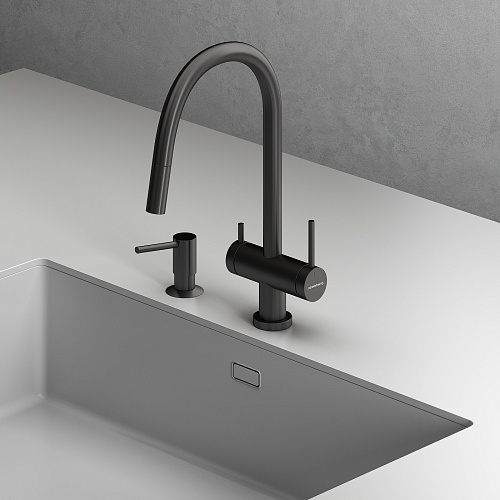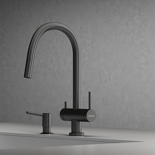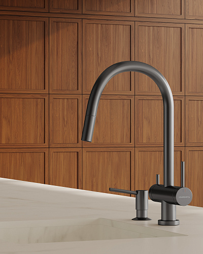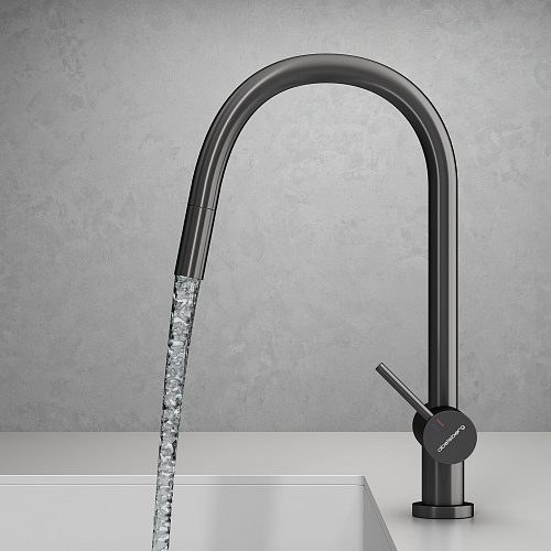 Смеситель для кухни ABELSBERG Aera c вытяжным изливом и возможностью подключения фильтра для воды, цвет космическая сталь, PVD покрытие, арт. EMF71709GM