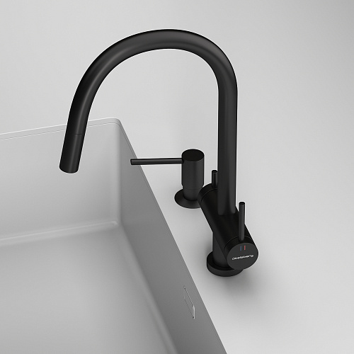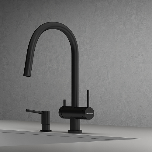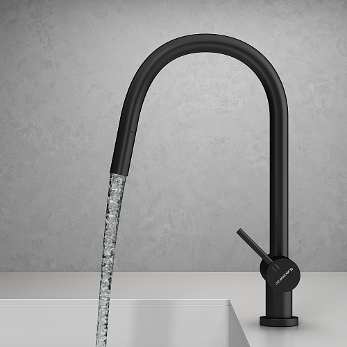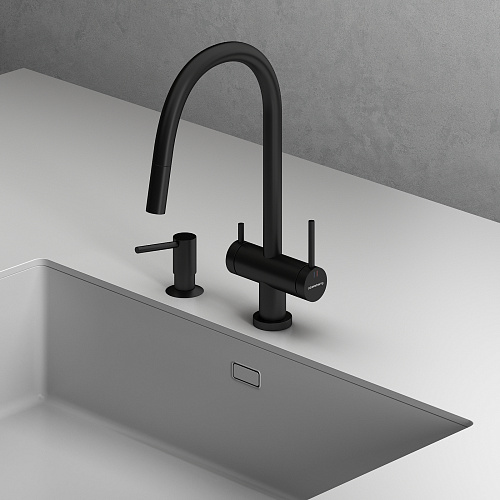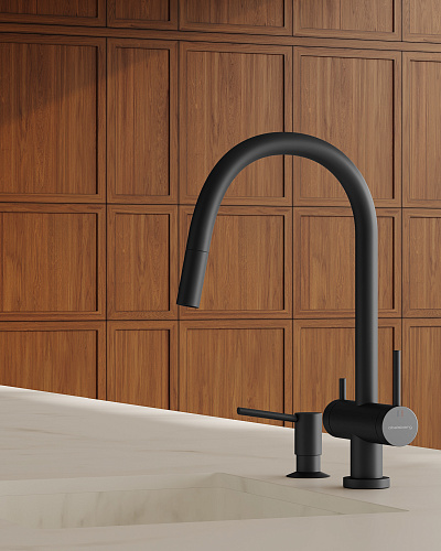 Смеситель для кухни ABELSBERG Aera c вытяжным изливом и возможностью подключения фильтра для воды, цвет матовый черный, арт. EMF71709MB