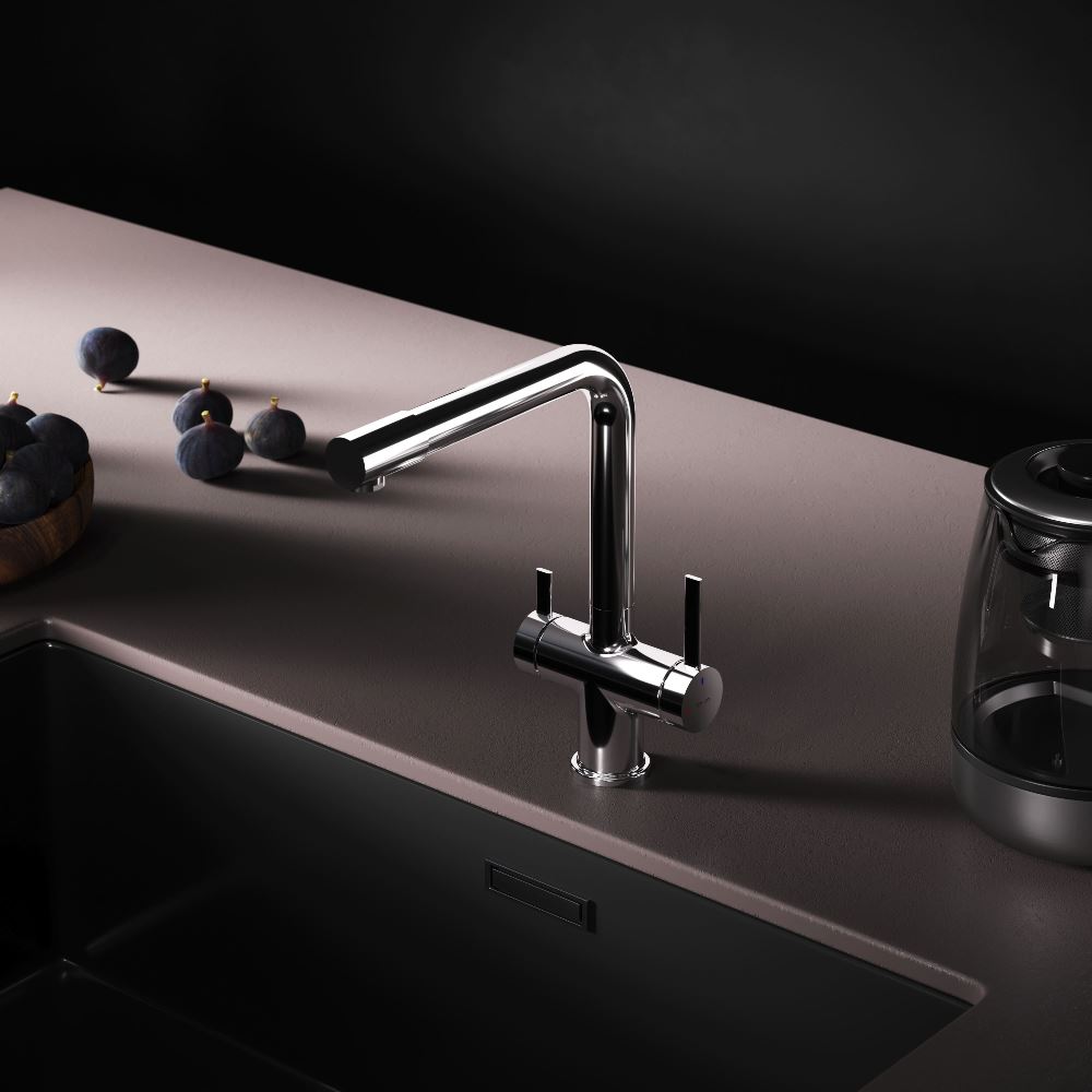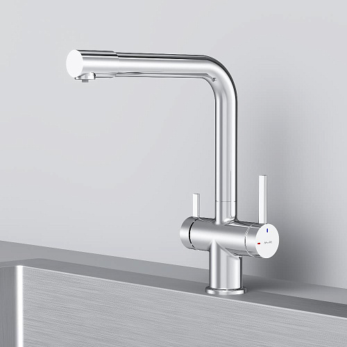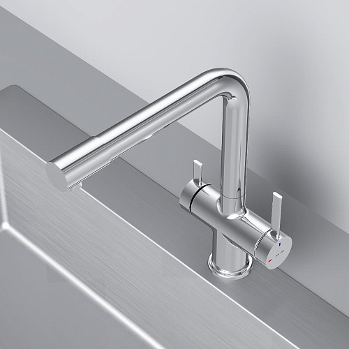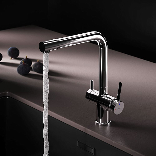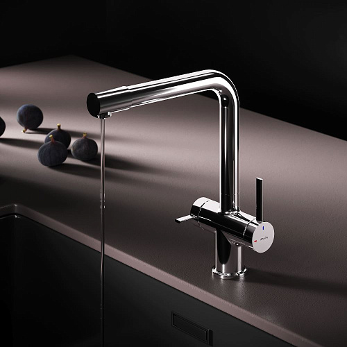 Встречайте долгожданное пополнение нашумевшей коллекции Func — кухонные смесители с оригинальными «фишками» характерными для всей коллекции. Дизайн характерный только для премиум-сегмента благодаря собственным дизайнерам бренда теперь представлен и в более доступной ценовой категории. Смеситель оснащён встроенным каналом для подачи питьевой воды. Чтобы получить питьевую воду воспользуйтесь ручкой расположенной с левой стороны корпуса для обычной воды управляйте смесителем привычным образом. Функция EcoStart — стильное и экологичное решение для вашего дома. При включении смесителя в центральном положении автоматически потечёт холодная вода. Для подачи горячей воды ручку нужно повернуть влево поворот вправо заблокирован. Оптимизация диапазона движения ручки смесителя позволяет сократить нерациональный расход воды до 40% в месяц. Дополнительным преимуществом функции EcoStart является возможность установить смеситель вплотную к стене что особенно важно в условии небольших кухонных пространств. Уникальная ручка в форме тонкого стика позволяет с легкостью управлять смесителем превращая повседневные задачи в настоящее удовольствие. Эксклюзивное покрытие Everlast вдвое превышает отраслевые стандарты по прочности и износостойкости. Ювелирный блеск и долговечность покрытия достигаются по стандарту Chrome Plating Standard NSS 80H. ""