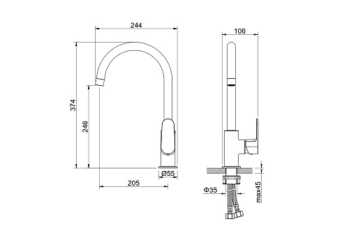 Оснащение 1. Смеситель 2. Гибкая подводка 60см 3. Монтажный комплект 4. Слив-перелив и донный клапан в комплект не входят