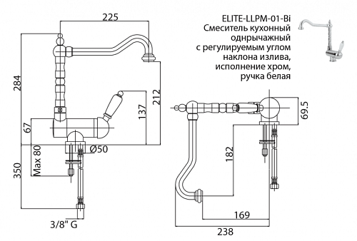 Смеситель Cezares ELITE-LLPM2-01-Bi кухонный однорычажный с регулируемым углом наклона излива, хром, ручка белая