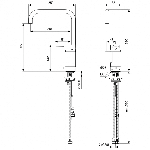 ACTIVE Однорычажный смеситель для кухонной мойки под 1 отверстие, система монтажа EASY-FIX (облегченный монтаж), гибкая подводка G3/8”, картридж 47 мм IS с функцией CLICK (ограничение потока воды), с функцией HWTC (ограничение максимальной температуры горячей воды), поворотный литой корпус, поворотный трубчатый излив, металлическая рукоятка с индикаторами горячей/холодной воды, скрытый аэратор CASHE M16.5x1 - A, с клапаном для подключения к посудомоечной машине.
