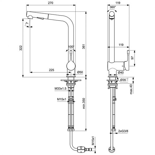 CERALOOK Однорычажный смеситель для кухонной мойки с высоким поворотным выдвижным изливом (длина 225 мм, высота 322 мм), угол поворота 360?, рукоятка сбоку, 2-х функциональный душ, керамический картридж 38 мм Firmaflow® с функцией HWTC (ограничение максимальной температуры горячей воды), с функцией CLICK (ограничение потока воды), гибкая подводка G3/8" (антибактериальные шланги PEX), монтаж IS-Fix - крепеж на центральной гайке M33x1,5 с двумя блокирующими винтами, с пластиковой опорной пластиной для более стабильного монтажа на мойке из нержавеющей стали, аэратор Perlator, металлическая рукоятка, индикаторы горячей/холодной воды на корпусе.