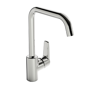 Смеситель для кухни с высоким поворотным изливом. Заводская установка угла поворота излива 120° (может быть ограничен до 60°). Встроенная опция ограничения расхода и температуры воды. F= с гибкой подводкой.