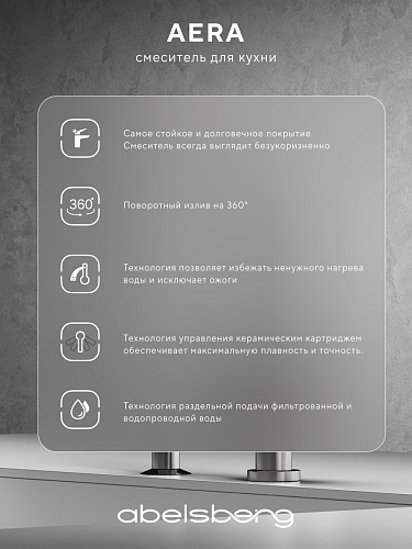 Коллекция Abelsberg Aera создаёт ощущение легкости и комфорта на кухне. Отдельный канал для питьевой воды обеспечивает высокую гигиену, а мягкие линии и сбалансированная эргономика смесителя делают ежедневное использование приятным. Abelsberg Aera — это классическое и проверенное временем решение, которое легко интегрируется в современную кухню.