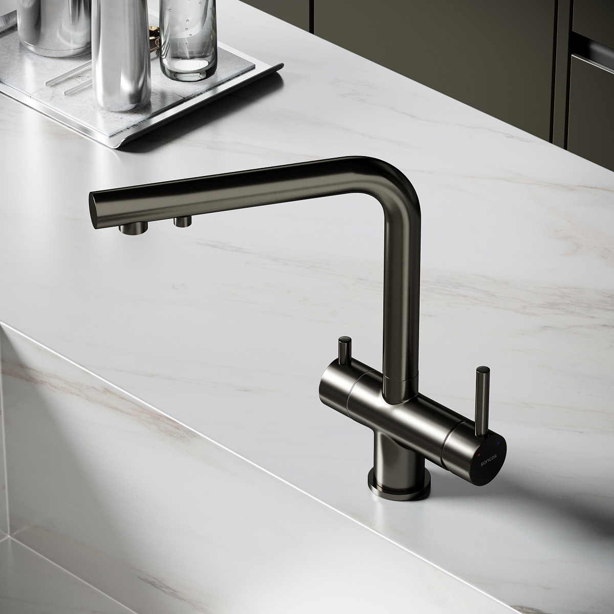 Поворотный металлический излив- возможность поворота на 360 ° Съемный аэратор для проведения очистки Керамический картридж SEDAL - плавная регулировка температуры и потока Отдельный кран для управления фильтрованной водой Излив для фильтрованной воды интегрирован в основной излив Стойкое покрытие методом элетроплейтинга
