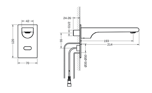 Сенсорный смеситель Материал смесителя - латунь Излив из латуни, длиной 208 мм Аэратор Neoperl Питание от сети 220 В или батарей 4×1. 5V AA Латунный смесительный клапан Гибкая подводка 3х50 см Декоративная пластина 120х70х4 мм Все части в комплекте