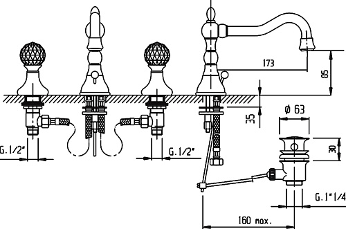 Смеситель на раковину на три отверстия, высокий, с донным клапаном, ручки Swarovski