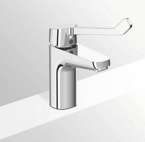 BASE GRANDE Хирургический/для людей с ограниченными возможностями однорычажный смеситель для раковины с удлиненной рукояткой (локтевого управления), под 1 отверстие, с донным клапаном, ограничение 5 л/мин.