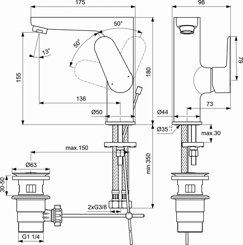 CERAFINE O Однорычажный смеситель для раковины с рукояткой сбоку.