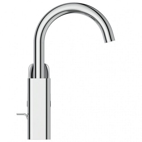 CERAPLAN Смеситель для раковины с высоким трубчатым поворотным изливом 180 мм, с металлическим донным клапаном, система монтажа EASY-FIX (облегченный монтаж), гибкая подводка G3/8", картридж FirmaFlow 38 мм с функцией HWTC (ограничение максимальной температуры горячей воды), металлическая рукоятка с индикаторами горячей/холодной воды, аэратор Slim с ограничением потока 5 л/мин.