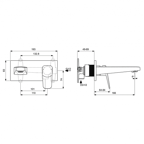 CERAPLAN Настенный смеситель для раковины, для монтажа со встраиваемым комплектом A1313NU (заказывается дополнительно), литой излив 180 мм, металлическая накладка, аэратор с ограничением потока 5 л/мин, картридж FirmaFlow 28 мм с функцией HWTC (ограничение максимальной температуры горячей воды), металлическая рукоятка с индикаторами горячей/холодной воды.