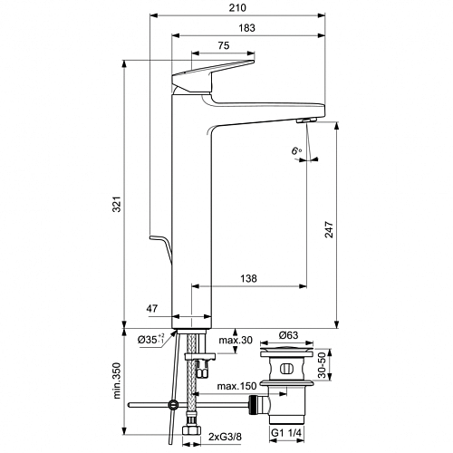 CERAPLAN Vessel Смеситель для раковины с металлическим донным клапаном, новая система монтажа EASY-FIX+ (облегченный монтаж), гибкая подводка G3/8", картридж FirmaFlow 38 мм с функцией HWTC (ограничение максимальной температуры горячей воды), металлическая рукоятка с индикаторами горячей/холодной воды, аэратор Slim с ограничением потока 5 л/мин.