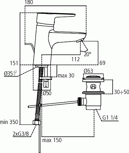 CONNECT BLUE Смеситель для раковины под 1 отверстие, система монтажа EASY-FIX (облегченный монтаж), центрирующее уплотнительное кольцо, гибкая подводка G3/8” (антибактериальные шланги PEX), картридж 40 мм IS с функцией CLICK (ограничение потока воды), с функцией HWTC (ограничение максимальной температуры горячей воды), металлическая рукоятка с индикаторами горячей/холодной воды, аэратор CASCADE M24x1 с ограничением потока 5 л/мин. технология BLUE (без никеля и свинца), с донным клапаном.