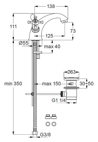 REFLECTIONS Двурукоятковый смеситель для умывальника под 1 отверстие, система монтажа EASY-FIX (облегченный монтаж), гибкая подводка G3/8, керамические кранбуксы G1/2”, литой корпус с отверстием под стержень донного клапана, металлический донный клапан, металлические рукоятки с индикатором горячей/холодной воды, аэратор CASCADE M24x1.