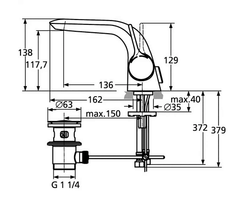 MELANGE Однорукоятковый смеситель для умывальника под 1 отверстие, система монтажа EASY-FIX (облегченный монтаж), гибкая подводка G3/8", картридж 35 мм KEROX с ограничителем горячей воды, литой корпус с отверстием под стержень донного клапана, металлический донный клапан, металлическая рукоятка с индикатором горячей/холодной воды, скрытый аэратор “CACHE” M21,5x1.