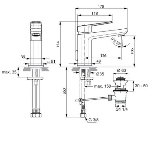 TONIC II Однорычажный смеситель для раковины. Картридж FirmaFlow 28 мм с функцией HTWC (ограничение максимальной температуры горячей воды). Гибкая подводка G3/8’’. Система монтажа EASY-FIX (облегченный монтаж). Регулируемый аэратор Cascade с ограничением потока 5 л/мин. Металлическая рукоятка с индикатором горячей/холодной воды. Декоративное металлическое кольцо. Металлический донный клапан.
