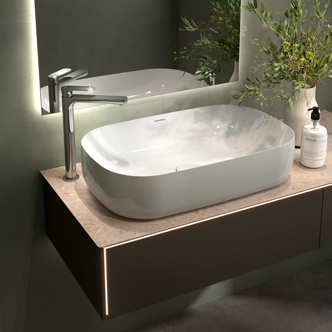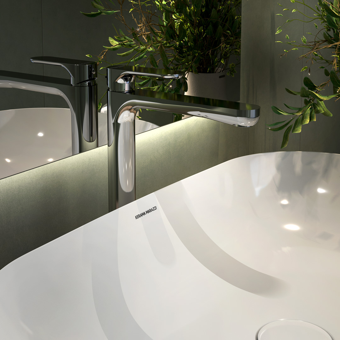 Высокий однорычажный смеситель OLE с обновлённым эргономичным дизайном представлен в трёх цветах (хром, чёрный матовый и золотой атласный). Модель устанавливается на столешницу, предназначена для использования с накладными раковинами KERAMA MARAZZI без отверстия под смеситель. Идеально cочетается со всеми артикулами серии OLE для душа и ванны.
