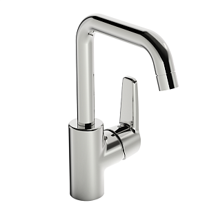 Смеситель для умывальника с высоким поворотным изливом. Встроенная опция ограничения расхода и температуры воды. Расход воды 6.0 л/мин. F= с гибкой подводкой.