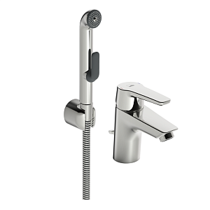 Смеситель для умывальника с донным клапаном и ручным душем Bidetta. Фиксированный излив, аэратор, шланг 1,5 м и настенный держатель. Встроенная опция ограничения расхода и температуры воды. Расход воды 6.0 л/мин. F= с гибкой подводкой.