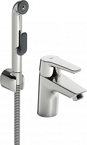Смеситель для умывальника с ручным душем Bidetta. Фиксированный излив, аэратор, шланг 1,5 м и настенный держатель. Встроенная опция ограничения расхода и температуры воды. Расход воды 6.0 л/мин. F= с гибкой подводкой.