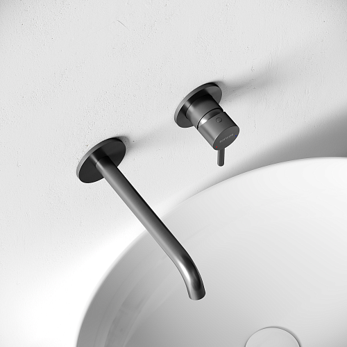 Встраиваемый в стену смеситель для раковины с внутренней частью из латуни; Точная регулировка температуры и напора воды с используемыми картриджами SEDAL (Испания); Мягкий поток воды без разбрызгивания за счёт силиконовых аэраторов Neoperl®; Надежное покрытие методом элетроплейтинга; Цвет вороненая сталь