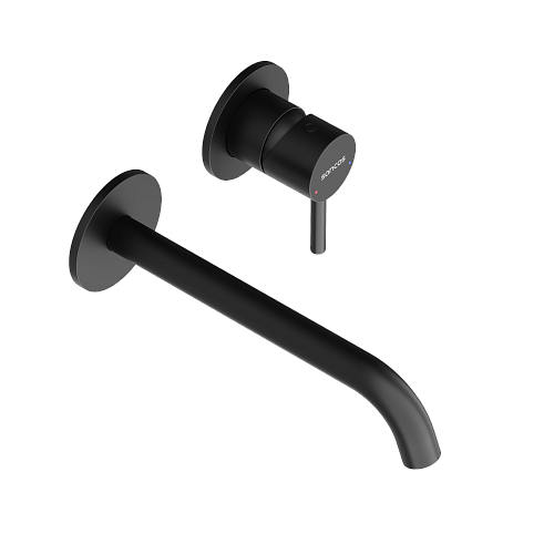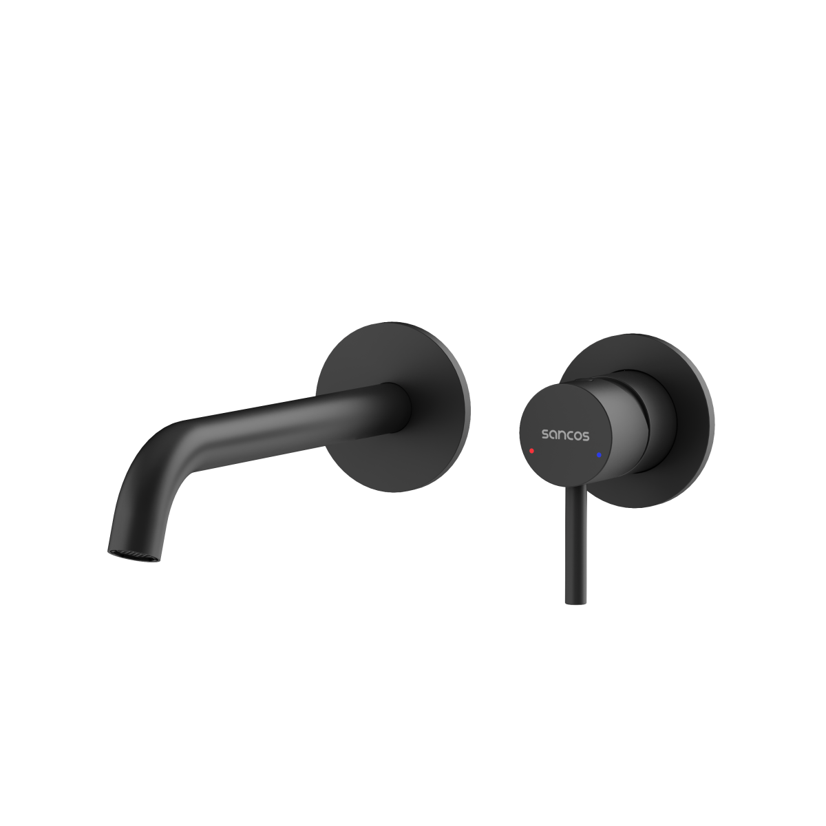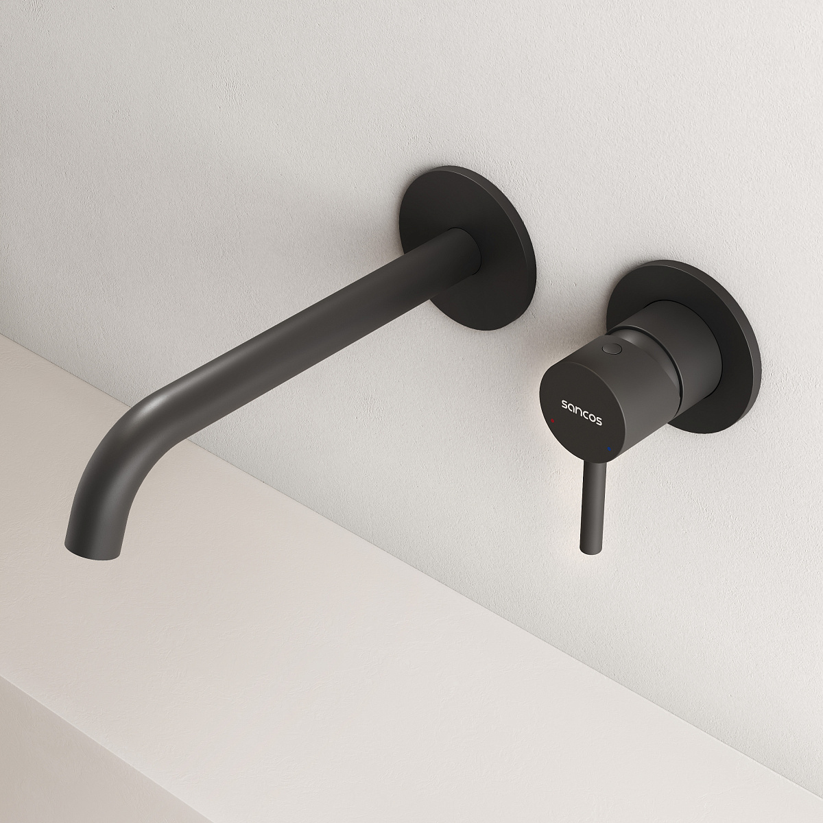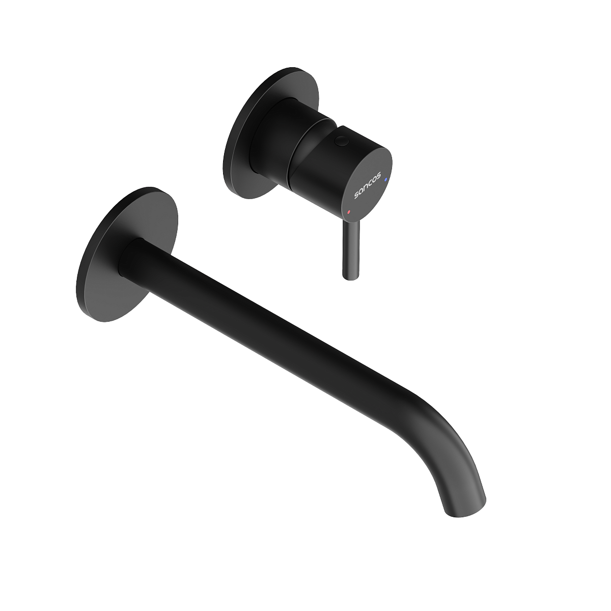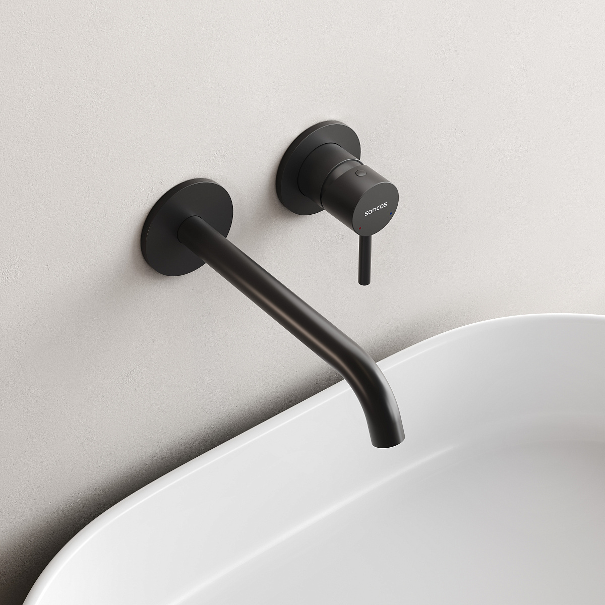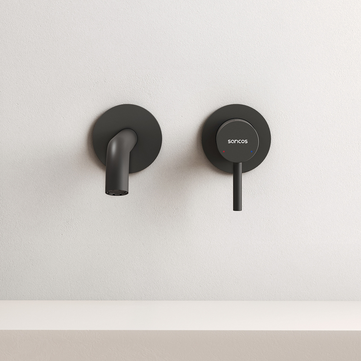 Встраиваемый в стену смеситель для раковины с внутренней частью из латуни; Точная регулировка температуры и напора воды с используемыми картриджами SEDAL (Испания); Мягкий поток воды без разбрызгивания за счёт силиконовых аэраторов Neoperl®; Надежное покрытие методом элетроплейтинга; Цвет матовый черный