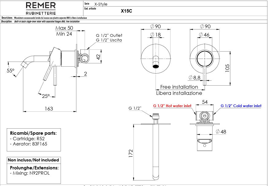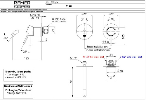 Смеситель для раковины, встраиваемый Remer Rubinetterie X-Style X15C