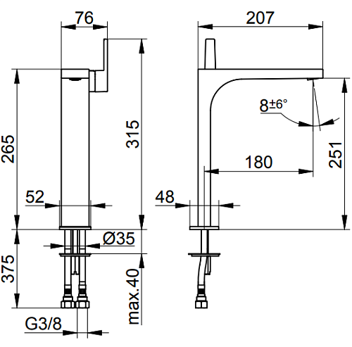 Без гарнитуры для слива и донного клапана, с системой быстрого монтажа, ограничитель температуры, аэратор SLIM SSR M 24x1, угол наклона струи регулируется, гибкая подводка 570 мм G3/8 дюйма, поток ограничен 7,6 л/мин.