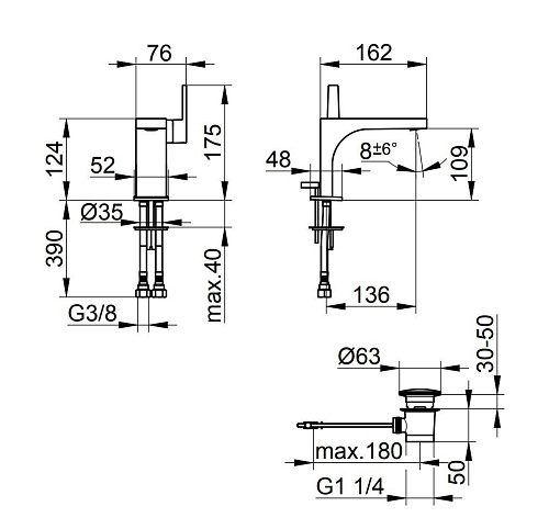 Оснащение Гарнитур для слива, донный клапан 1.1/4", система быстрого монтажа, аэратор SLIM SSR M 24x1, угол наклона струи регулируется, гибкая подводка 435 мм G3/8 дюйма, поток воды ограничен 7,6 л/мин.