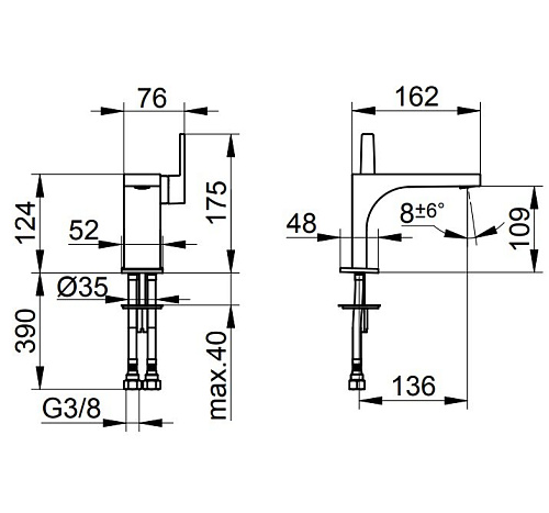 Без гарнитуры для слива и донного клапана, с системой быстрого монтажа, ограничитель температуры, аэратор SLIM SSR M 24x1, угол наклона струи регулируется, гибкая подводка 435 мм G3/8 дюйма, поток ограничен 7,6 л/мин.