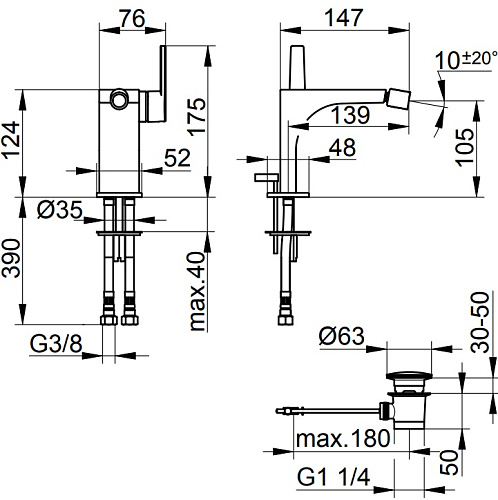 Оснащение Гарнитура для слива, донный клапан 1.1/4", система быстрого монтажа, ограничитель температуры, на шарнире, аэратор cache TT M 18,5x1, гибкая подводка 420 мм G3/8 дюйма, поток ограничен 7,6 л/мин.