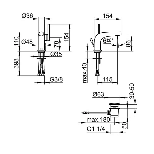 Оснащение Гарнитур для слива, донный клапан 1.1/4", система быстрого монтажа, аэратор SLIM SSR M 24x1, угол наклона струи регулируется, гибкая подводка 435 мм G3/8 дюйма, поток воды ограничен 7,6 л/мин.