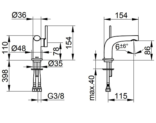 Без гарнитуры для слива и донного клапана, с системой быстрого монтажа, ограничитель температуры, аэратор SLIM SSR M 24x1, угол наклона струи регулируется, гибкая подводка 435 мм G3/8 дюйма, поток ограничен 7,6 л/мин.