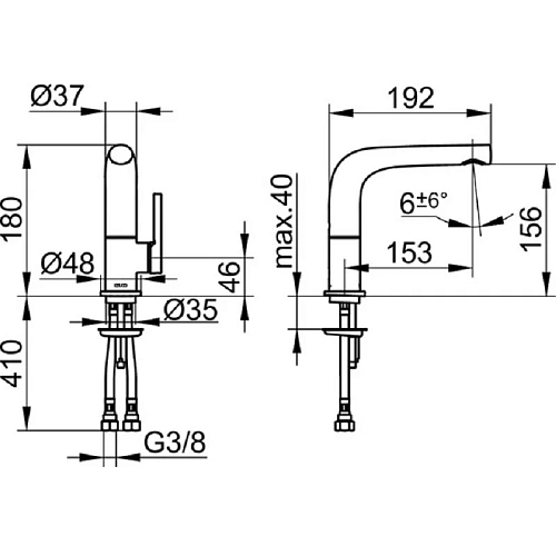Без гарнитуры для слива и донного клапана, поворотный излив +/- 45°, с системой быстрого монтажа, аэратор SLIM SSR M 24x1, угол наклона струи регулируется, гибкая подводка 435 мм G3/8 дюйма, поток воды ограничен 7,6 л/мин.