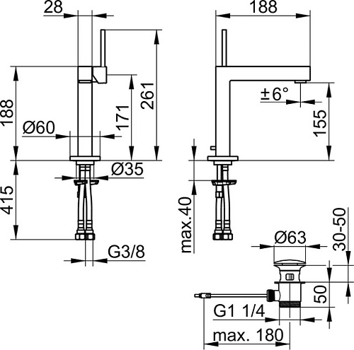 Оснащение Гарнитур для слива, донный клапан 1.1/4", система быстрого монтажа, аэратор M 24x1, угол наклона струи регулируется, гибкая подводка 435 мм G3/8 дюйма, поток воды ограничен 7,6 л/мин.