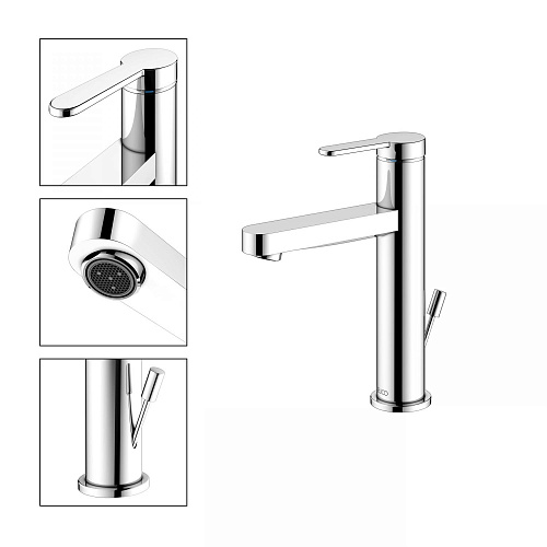 Оснащение Гарнитур для слива, донный клапан 1.1/4", с розеткой (круглой), система быстрого монтажа, аэратор M 20x1, гибкая подводка 570 мм G3/8 дюйма, поток воды ограничен 7 л/мин.