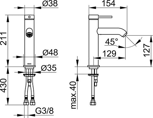 Без гарнитуры для слива и донного клапана, с системой быстрого монтажа, с розеткой (круглой), аэратор M 20x1, угол наклона струи регулируется, гибкая подводка 570 мм G3/8 дюйма, поток ограничен 7 л/мин.