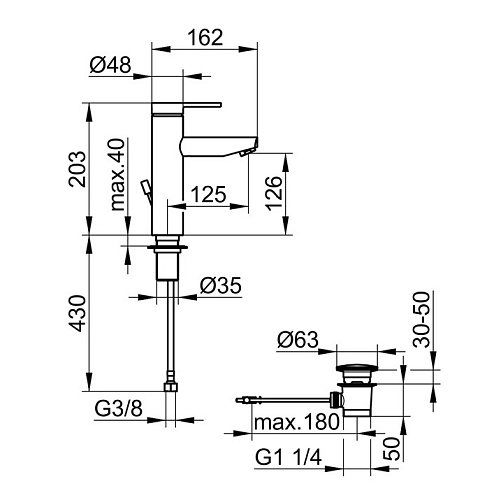 Оснащение Гарнитур для слива, донный клапан 1.1/4", система быстрого монтажа, ограничитель температуры, аэратор M 24x1, угол наклона струи регулируется +/- 8°, гибкая подводка 570 мм G3/8 дюйма, расход воды ограничен 6 л./мин.