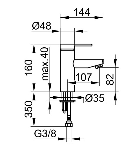 Без гарнитуры для слива и донного клапана, с системой быстрого монтажа, ограничитель температуры, аэратор M 24x1, угол наклона струи регулируется +/- 8°, гибкая подводка 420 мм G3/8 дюйма, расход воды ограничен 6 л./мин.