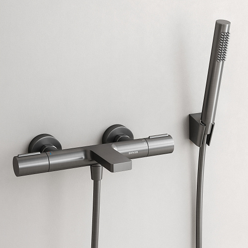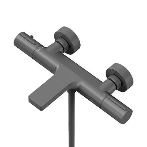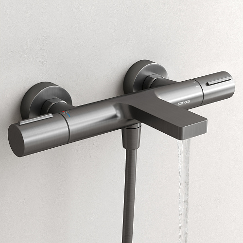 Смеситель для ванны и душа с термостатом; Корпус выполнен из прочной латуни; Фиксированный излив; Высокочувствительный катридж SEDAL (Испания) позволит мгновенно настроить желаемую температуру воды; Мягкий поток воды без разбрызгивания за счёт силиконовых аэраторов Neoperl®;Предустановленный ограничитель температуры при 40°; Система защиты от ожогов при отключении холодной воды; Встроенный дивертер для переключения между источниками воды; Встроенный клапан защиты от обратного потока; Цвет вороненая сталь
