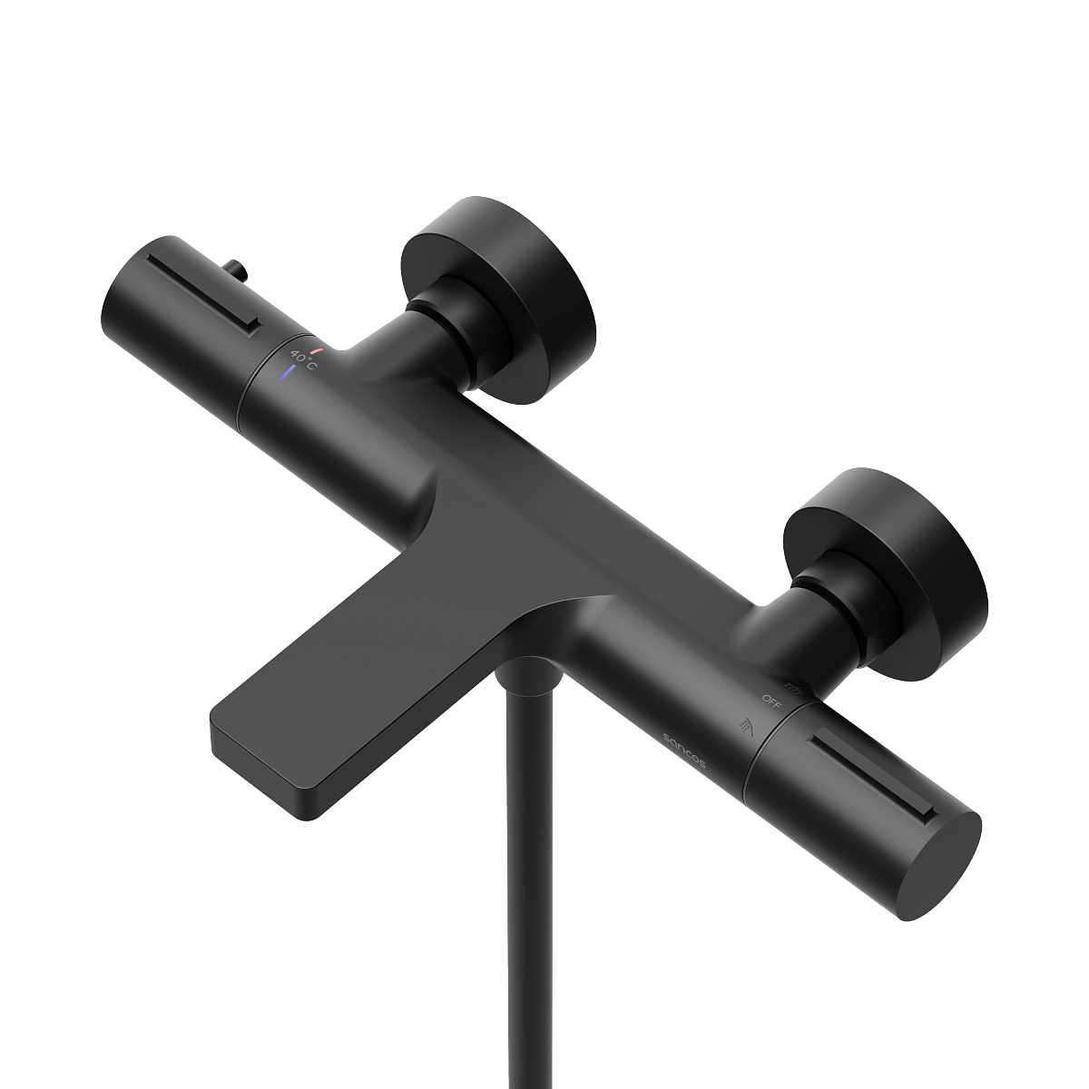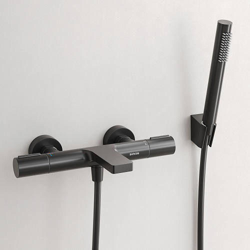 Смеситель для ванны и душа с термостатом; Корпус выполнен из прочной латуни; Фиксированный излив; Высокочувствительный катридж SEDAL (Испания) позволитмгновенно настроить желаемую температуру воды; Мягкий поток воды без разбрызгивания за счёт силиконовых аэраторов Neoperl®;Предустановленный ограничитель температуры при 40°; Система защиты от ожогов при отключении холодной воды; Встроенный дивертер для переключения между источниками воды; Встроенный клапан защиты от обратного потока; Цвет матовый черный