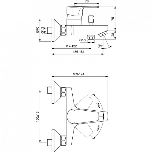 CERAFINE D Настенный смеситель для ванны/душа, картридж 38 мм FirmaFlow с функцией HWTC (ограничение максимальной температуры горячей воды), монтаж на стандартных эксцентриках (в комплекте: эксцентрики, металлические отражатели, уплотнительные прокладки), металлическая рукоятка с индикаторами горячей/холодной воды, обратный клапан, аэратор Perlator, автоматическое переключение.