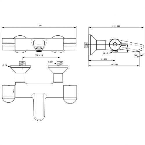 CERAPLUS 2.0 Настенный термостатический смеситель для ванны/душа, термостатический картридж с возможностью термической дезинфекции, керамический переключатель, винт ограничения максимальной температуры, стандартный обратный клапан и клапан для ослабления давления (для горячей воды), стандартные эксцентрики, ламинарный регулятор потока (защита от попадания бактерий) (ключ в комплекте), металлическая рукоятка с дополнительным выступом с нестираемыми индикаторами горячей/холодной воды, класс шумности 1.