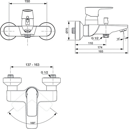 CONNECT AIR Настенный смеситель для ванны/душа, керамический картридж IS 40 мм с функцией HWTC (ограничение максимальной температуры горячей воды), с функцией CLICK (ограничение потока воды), монтаж на стандартных эксцентриках (в комплекте: эксцентрики, пластиковые отражатели, уплотнительные прокладки).