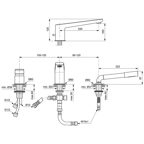 TONIC II Набортный смеситель для ванны/душа под 3 отверстия.