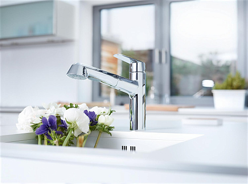 средний излив монтаж на одно отверстие GROHE StarLight хромированная поверхность GROHE SilkMove керамический картридж 35 мм выдвижная лейка Dual автоматический переключатель аэратор/SpeedClean душевая струя автоматическое возвратное переключение на аэратор после выключения регулировка расхода воды поворотный литой излив, зона поворота излива 100° с защитой от обратного потока гибкая подводка, система быстрого монтажа минимальное давление 1,0 бар